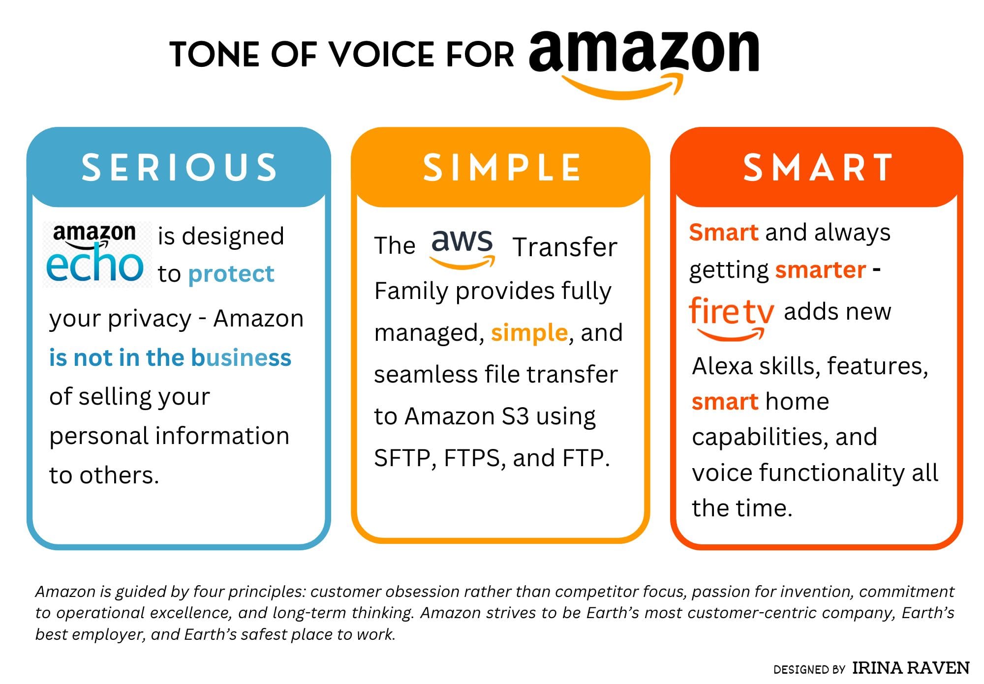 Amazon’s voice of tone can be summed up in three words: Serious, Simple, and Smart. It’s serious in the sense that it communicates with clarity and professionalism, especially when it comes to product information and customer support. At the same time, the tone remains simple, using plain language that’s easy to understand, even when explaining its products. Finally, it feels smart, reflecting Amazon’s innovative brand by anticipating user needs and providing intelligent, well-structured content. This consistent tone helps build trust and makes the user experience feel efficient and reliable.