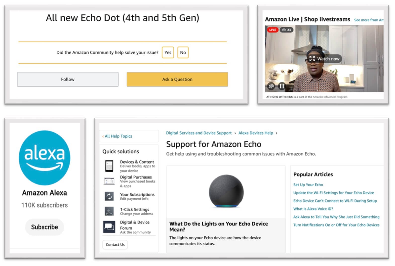 The support content experience focuses on providing users with the information they need to find answers to their questions or resolve issues quickly and efficiently. Amazon offers a range of resources to support this, including community forums where users can share solutions, step-by-step how-to guides and videos for common tasks, and direct access to Customer Service for personalized help. Additionally, Help pages offer comprehensive information on a wide range of topics, while the Influencer Program and social media channels extend support through trusted voices and real-time engagement. Together, these tools ensure users feel supported at every stage of their experience.